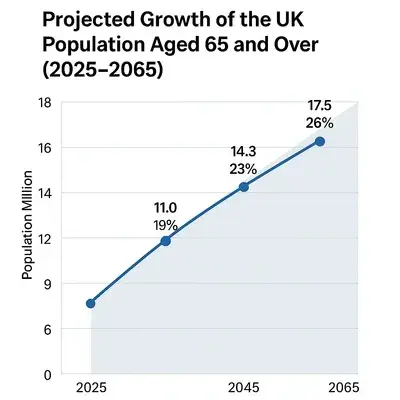 The UK’s population is steadily aging. According to the Office for National Statistics, over 11 million people in the UK are aged 65 and over—a figure projected to rise significantly in the next two decades. With increased life expectancy and lower birth rates, the demographic landscape is shifting, placing strain on public health systems, pensions, and social care infrastructure.